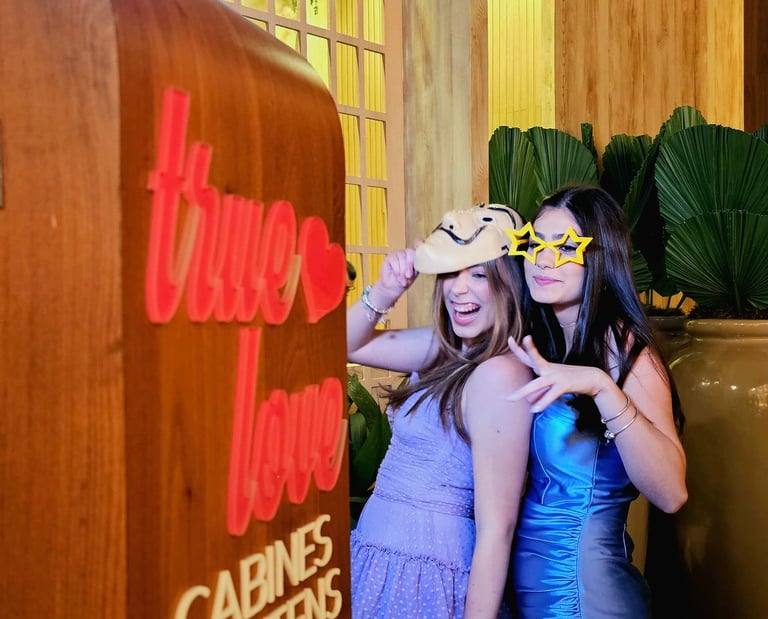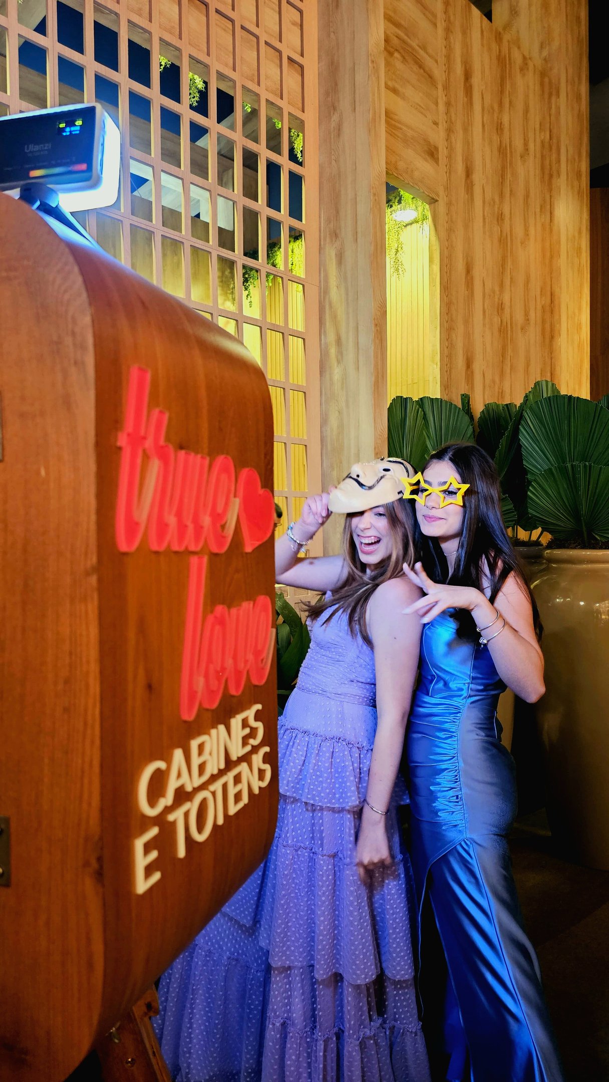 Os convidados se posicionam em frente ao totem enquanto as fotos são registradas de forma simples e divertida. Em poucos segundos, as imagens são impressas na hora com qualidade profissional Fujifilm, criando uma lembrança física do evento.