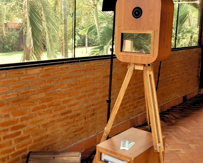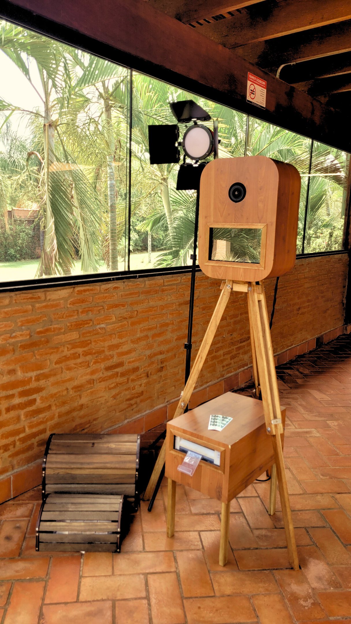 Com estrutura em madeira e design inspirado nos equipamentos fotográficos clássicos, ele se torna também um elemento decorativo que chama a atenção dos convidados.